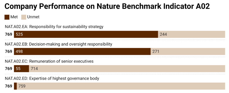 Mentre il 72% delle aziende del Nature Benchmark soddisfa almeno un aspetto dell’indicatore A2 (figura 3), un esame più attento mostra che ancora una volta i progressi su alcuni sottoindicatori sono molto maggiori che su altri. Bene sull’impiego di persone dedicate unicamente alla sostenibilità dell’azienda, dato che il 68% delle imprese considerate ne è in possesso. Un buon risultato anche sull’attribuzione delle responsabilità decisionali e di controllo sulla sostenibilità ai massimi organi di governo (65%). Eppure, solo il 7% delle società collega i criteri di performance nelle politiche retributive dei dirigenti senior a traguardi e obiettivi che coprono la natura e le questioni sociali e appena l’1% dimostra che i membri dei Cda hanno esperienza rispetto ai temi di sostenibilità più materiali dell’azienda. Ciò sottolinea una carenza critica nella profondità dell’integrazione della sostenibilità nei meccanismi esecutivi e di governance.