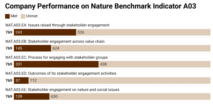 Anche in questo caso, oltre la metà delle aziende (53%) soddisfa almeno uno degli elementi dell’indicatore A3. Nel dettaglio, il 43% descrive i propri processi di coinvolgimento degli stakeholder e il 31% rende pubbliche le questioni sollevate durante i processi di engagement. Tuttavia, solo il 19% delle imprese considerate divulga informazioni sui propri processi di identificazione degli stakeholder rilevanti e soltanto il 7% delle aziende descrive come integra il feedback degli stakeholder nella propria strategia di sostenibilità. Rispetto all’indicatore A3, inoltre, gli autori dello studio riscontrano che appena il 18% dell’attività di engagement con gli stakeholder riguarda sia la natura che le questioni sociali. Un dato che indica una probabile lacuna nella conoscenza da parte dell’azienda degli interessi degli stakeholder, poiché gli aspetti sociali sono profondamente intrecciati con la natura.