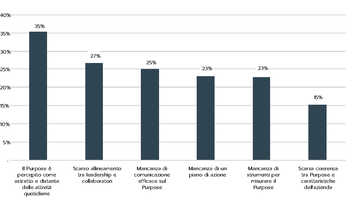 Dall’analisi emerge che i benefici legati alla presenza del purpose risultano più evidenti in ambiti come la motivazione dei dipendenti (citata dal 51% dei manager), le relazioni esterne e la reputazione (46%). Al contrario, il purpose è meno associato al raggiungimento diretto degli obiettivi di business (solo il 36% dei manager lo afferma), suggerendo che viene percepito come un elemento che promuove coesione interna e costruisce una reputazione solida all’esterno, ma non ancora come uno strumento direttamente collegato al risultato economico. Tra le principali difficoltà che le aziende incontrano nell’integrare il purpose nelle loro realtà, infatti, c’è la percezione che sia qualcosa di astratto, oltre alla mancanza di allineamento e comunicazione.