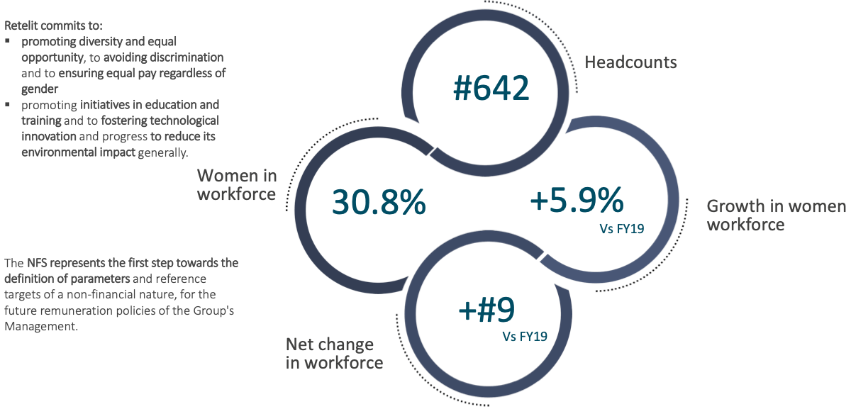 La Dnf della Retelit si ispira agli elementi essenziali dell’Agenda 2030, approvata nel 2015 dalle Nazioni Unite con i suoi 17 obiettivi (SDGs) per uno sviluppo sostenibile. Retelit si impegna nella promozione di diversità e pari opportunità, nella non discriminazione e nell’equa remunerazione tra i generi. In questo senso, durante il 2020, il numero delle donne lavoratrici è aumentato del 5,9% rispetto al 2019.