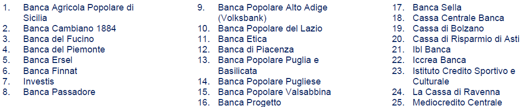 È prevista nel mese di ottobre l’emissione dei Corporate SER anche per Cassa di Risparmio di Asti, Iccrea Banca, Banca Ersel e Banca del Piemonte. Il Benchmark è composto dai maggiori 25 istituti bancari non quotati per mezzi amministrati. Nella tabella che segue sono riportati i costituenti.
