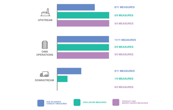 Come si evince dal grafico, i dati evidenziano come il controllo sulle operazioni proprie sia l’unico terreno comune a tutte le 21 misure analizzate. Tuttavia, spostandosi lungo la filiera, il rigore normativo si fa asimmetrico: se le attività a monte (upstream) sono presidiate dalla quasi totalità dei provvedimenti (inclusi tutti quelli relativi alla trasparenza e ai prodotti), la copertura delle attività a valle (downstream) appare ancora frammentaria. Solo 5 delle 11 misure sulla dovuta diligenza e appena 1 delle 5 misure sulla trasparenza estendono infatti la responsabilità alla fase di distribuzione e smaltimento, mentre le misure basate sul prodotto la escludono totalmente. Questa divergenza suggerisce che, mentre il monitoraggio dei fornitori è ormai un obbligo consolidato, la vigilanza sull’uso e sul fine vita dei prodotti rimane una sfida normativa ancora aperta e disomogenea.