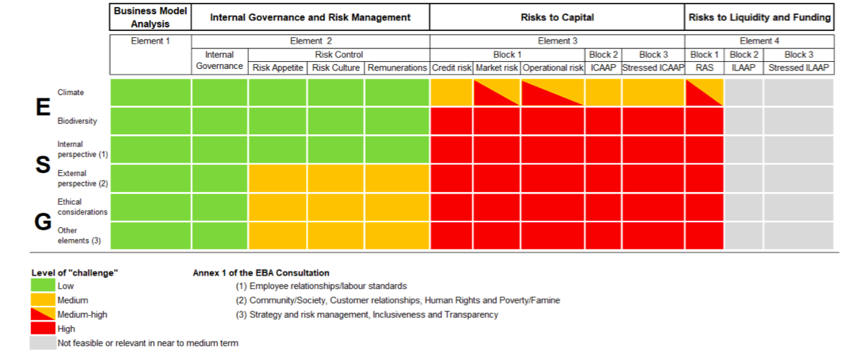 Il focus principale del documento di discussione riguarda i rischi a cui sono esposti gli istituti per l’impatto dei fattori ESG sulle loro controparti. A questo riguardo l’ambito di definizione dei fattori ESG dovrebbe essere il più ampio possibile e dovrebbero essere chiariti alcuni punti quali, per esempio, se tenere in considerazione il rischio reputazionale legato alle controparti che vengono finanziate e se le altre istituzioni finanziarie vanno ritenute controparti. Inoltre ci sono rischi che non derivano direttamente da controparti e devono essere a loro volta considerati con una definizione più ampia.