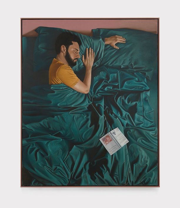 Il dipinto acquistato prosegue la serie di ritratti di persone dormienti che Di Massimo ha iniziato nel 2021. In quest’opera, l’artista si concentra su se stesso, solo e assopito tra lenzuola di colore verde in compagnia solo di un personaggio elettivo.