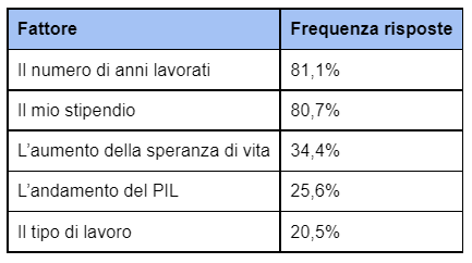 Soltanto il 4% conosce tutti i fattori che impattano sull’importo dell’assegno pensionistico ossia: anzianità contributiva (il numero di anni lavorati), stipendio, aumento della speranza di vita, andamento del PIL e tipo di lavoro.