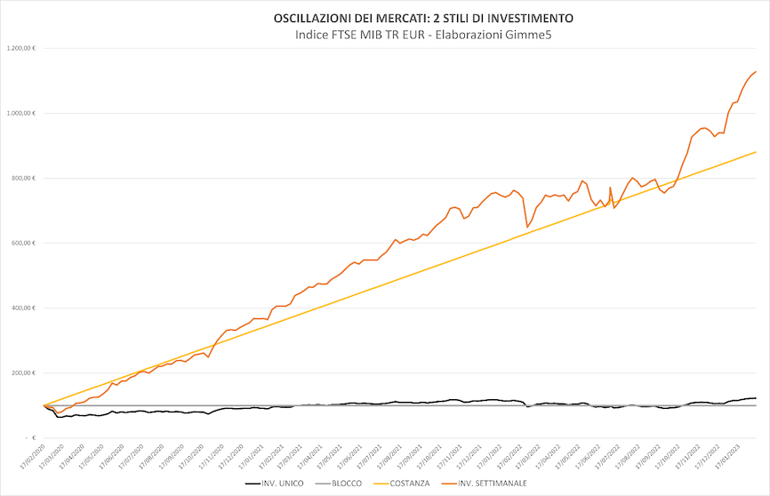 La simulazione analizza i risultati che due investitori avrebbero potuto raggiungere seguendo due diversi stili di investimento (Bloccato e Costante) nel periodo compreso tra febbraio 2020, quando lo scoppio della pandemia ha determinato il crollo dei mercati, e febbraio 2023, passando per le oscillazioni causate dal conflitto in Ucraina nel corso del 2022: