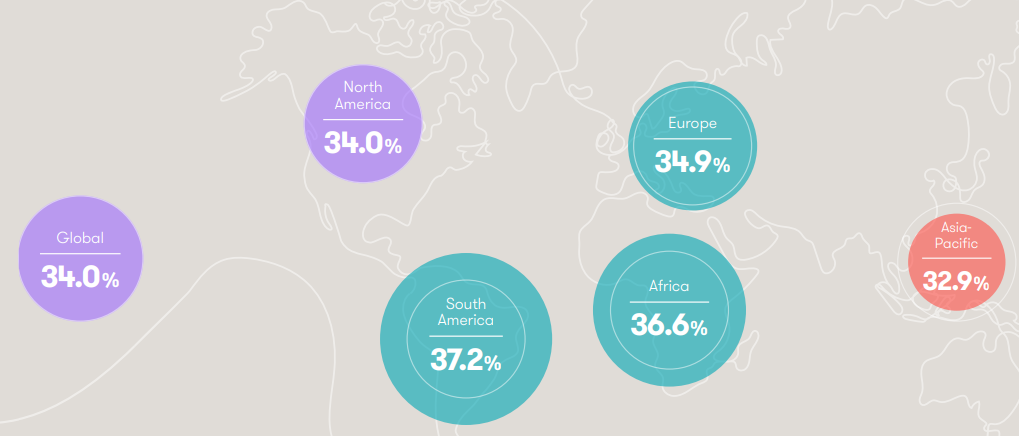 La percentuale di ruoli di senior management occupati da donne nel 2025 per regione geografica